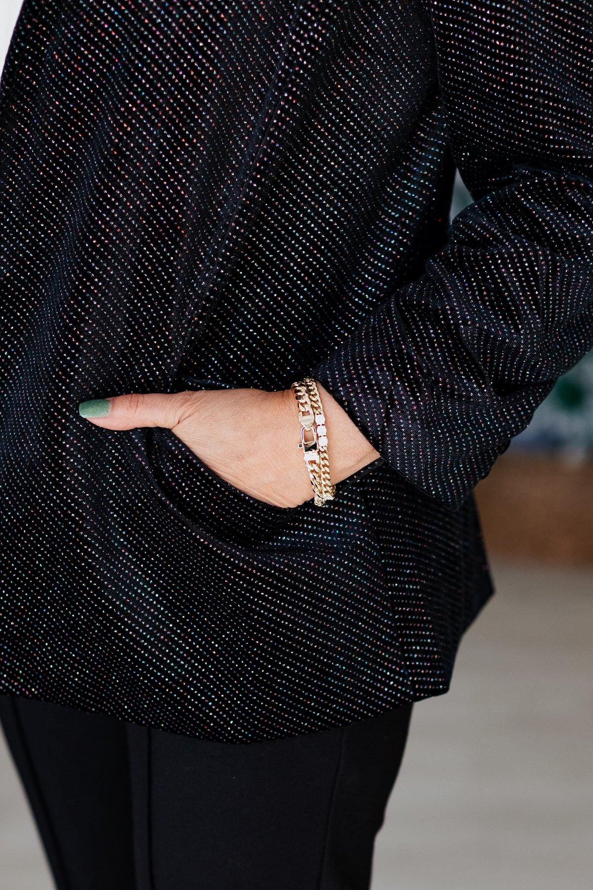 Elevate your holiday wardrobe with this stunning black velvet multicolor embellished blazer that strikes the perfect balance between sophisticated and spirited. Adorned with shimmering rhinestones that catch the light beautifully, this piece transforms any outfit into something special—whether you're heading to a festive party or a chic dinner. The classic black silhouette keeps things timeless while the sparkling embellishments add just the right amount of glamour and personality. Perfect for making a memorable entrance this season.