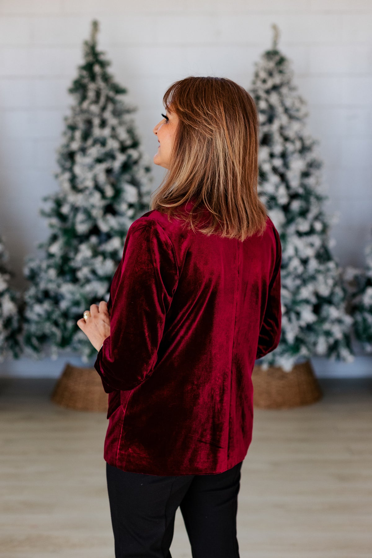Elevate your holiday wardrobe with this stunning burgundy velvet blazer that effortlessly blends festive flair with polished sophistication. The luxurious velvet fabric drapes beautifully, creating a rich, eye-catching look perfect for seasonal celebrations, office parties, or upscale gatherings. Layer it over your favorite dress or pair it with tailored trousers for an instantly chic ensemble that says "I've got style and I know it." Whether you're spreading holiday cheer or commanding the boardroom, this blazer is your secret weapon for looking absolutely fabulous.