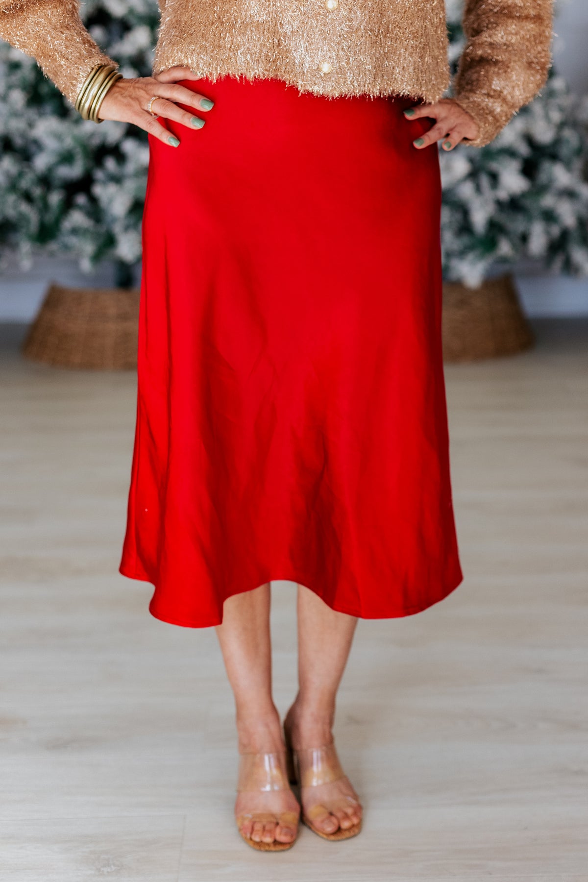 Elevate your holiday wardrobe with this red wine satin midi skirt. Its smooth, luxurious fabric catches the light with every step, while the rich color adds a touch of romance to chilly days. Perfect for twirling into festive evenings or pairing with cozy knits, this skirt combines elegance and comfort with a playful twist.
