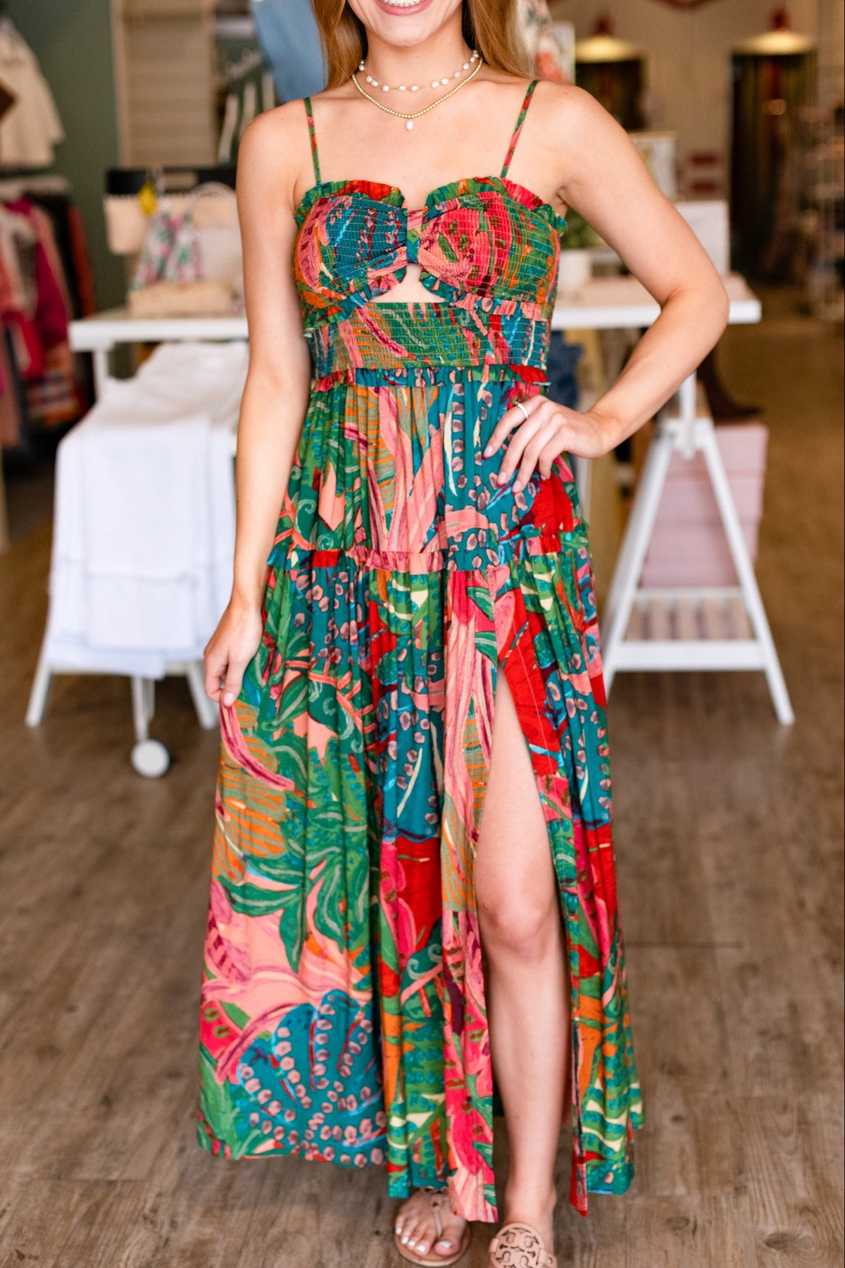 Escape to paradise in this lush maxi dress bursting with vibrant florals and rich greens in a stunning multi-color palette. The smocked bust creates a flattering, comfortable fit that moves with you, while the flowing maxi length keeps things breezy and elegant. Perfect for tropical getaways, resort dinners, or anywhere your vacation dreams take you. Pack it and prepare to feel like you're living your best island life!