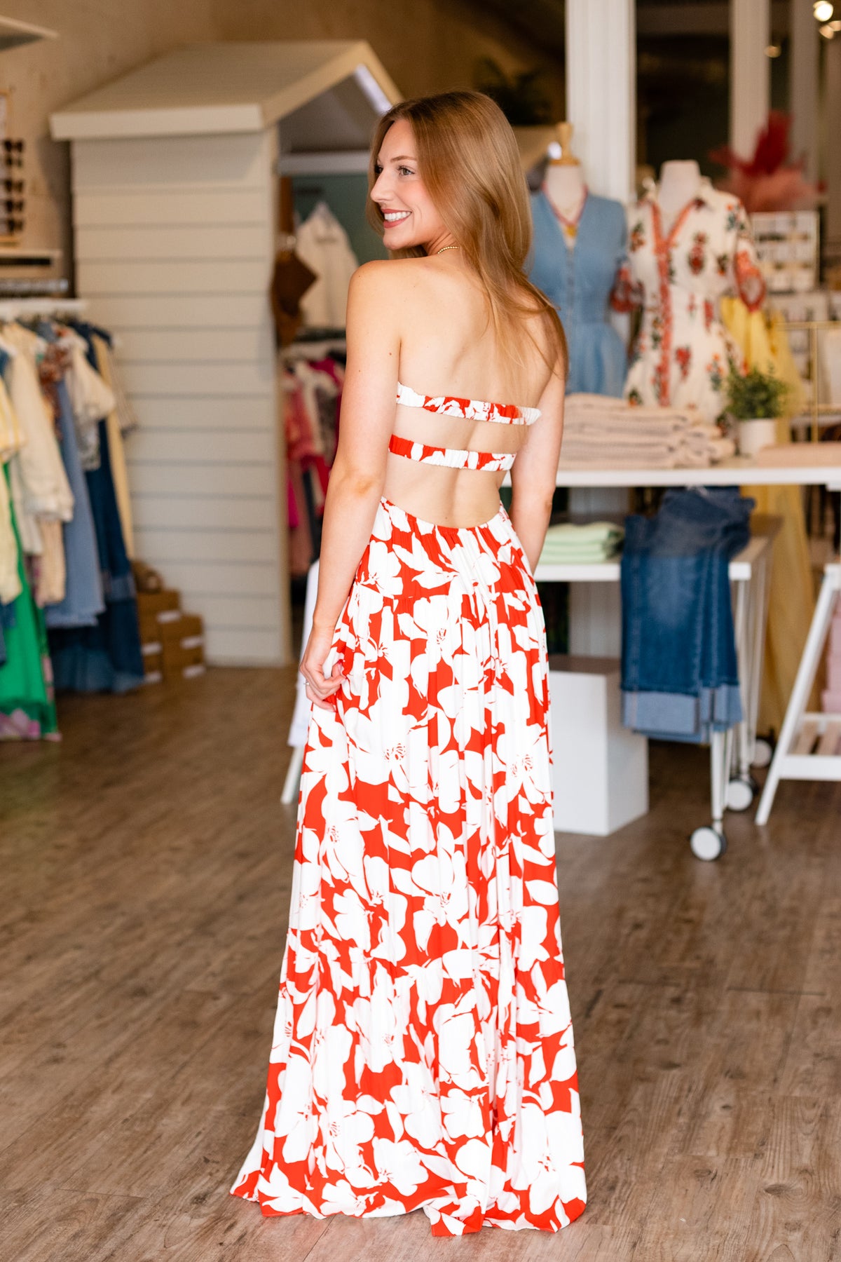 Get ready to turn heads in this stunning strapless maxi dress bursting with romantic white and red florals. The ruched bust hugs you in all the right ways while the daring open back adds that flirty, vacation-ready edge. Perfect for tropical getaways, beachside dinners, or anywhere you want to feel effortlessly gorgeous. Pack this beauty and let the adventure begin!
