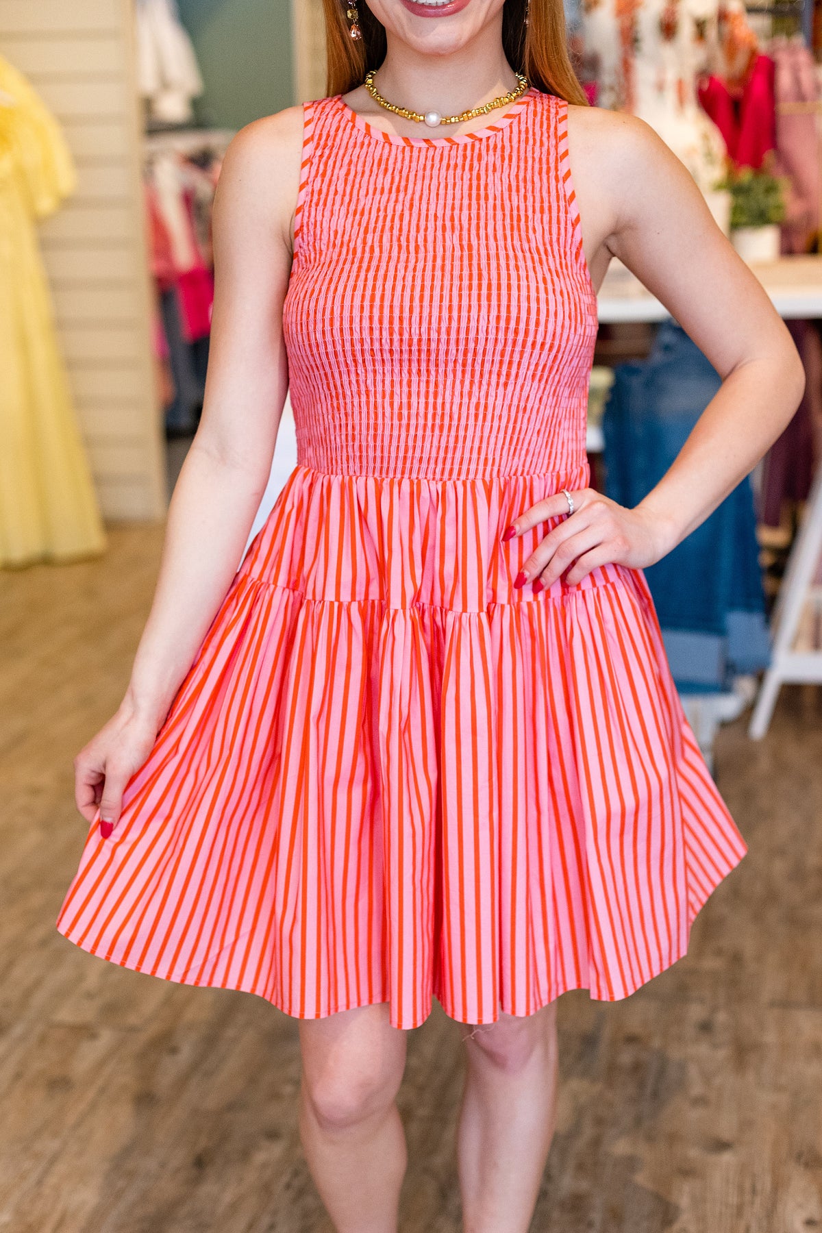 Twirl into summer in this vibrant striped mini dress! Featuring bold pink and orange stripes that pop against your skin, the sleeveless cut keeps you cool while the flowy skirt moves with every step. Perfect for beach days, outdoor festivals, or spontaneous adventures—this dress brings instant joy and effortless style to your warm-weather wardrobe.