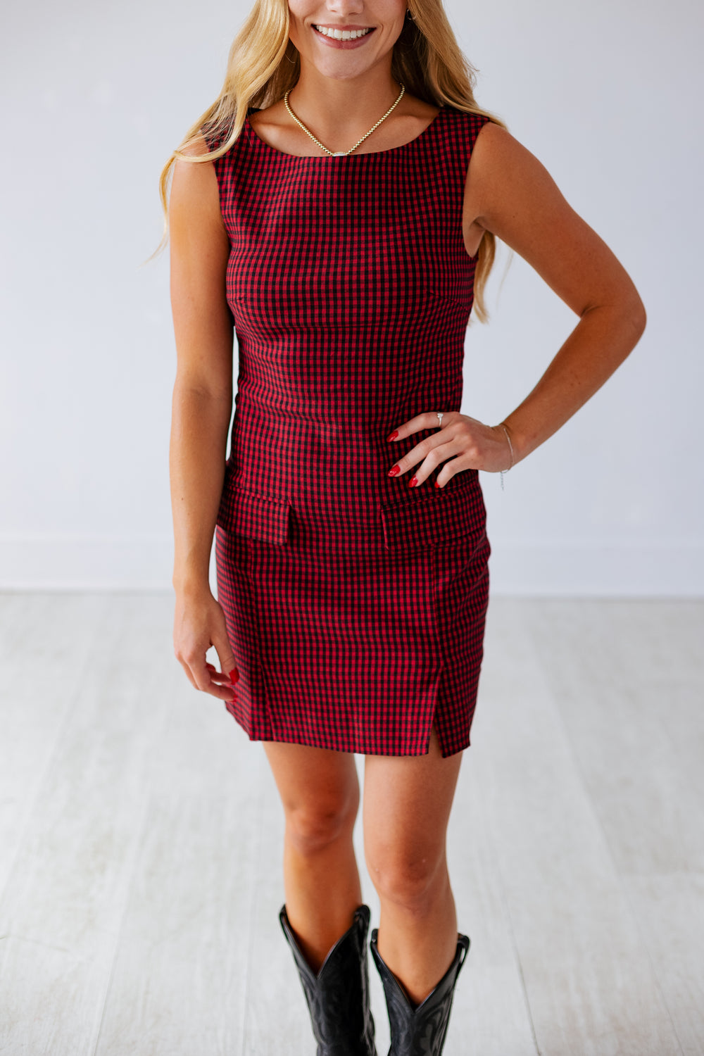 Step into fall with this playful cherry red and black gingham mini dress. Featuring faux pockets for a chic touch without the bulk, it’s perfect for layering or wearing solo. Its vibrant pattern and flirty length make it a fun addition to your seasonal wardrobe.