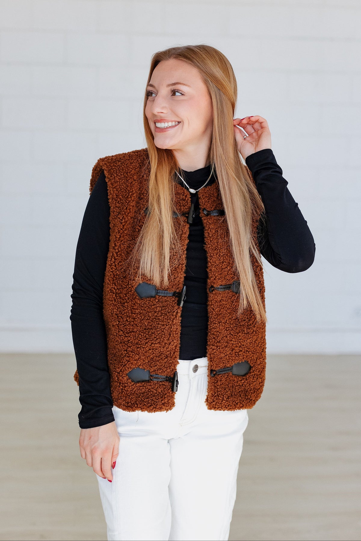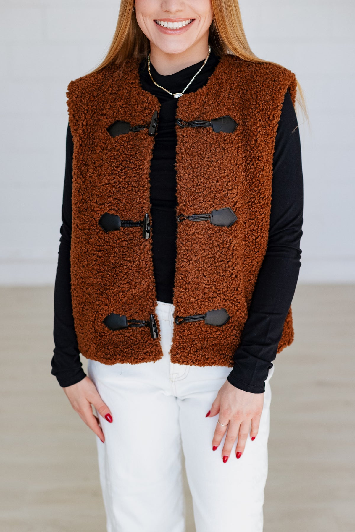 Wrap yourself in cozy comfort with the Brown Fuzzy Toggle Vest—your new winter essential! This plush chocolate-colored layer features charming toggle closures that make getting dressed feel like a breeze. Perfect for layering over your favorite tees or sweaters, it adds instant warmth and texture to any cold-weather outfit. Whether you're running errands or settling in for a relaxed day, this fuzzy favorite brings both style and snuggle-worthy softness to your seasonal rotation.