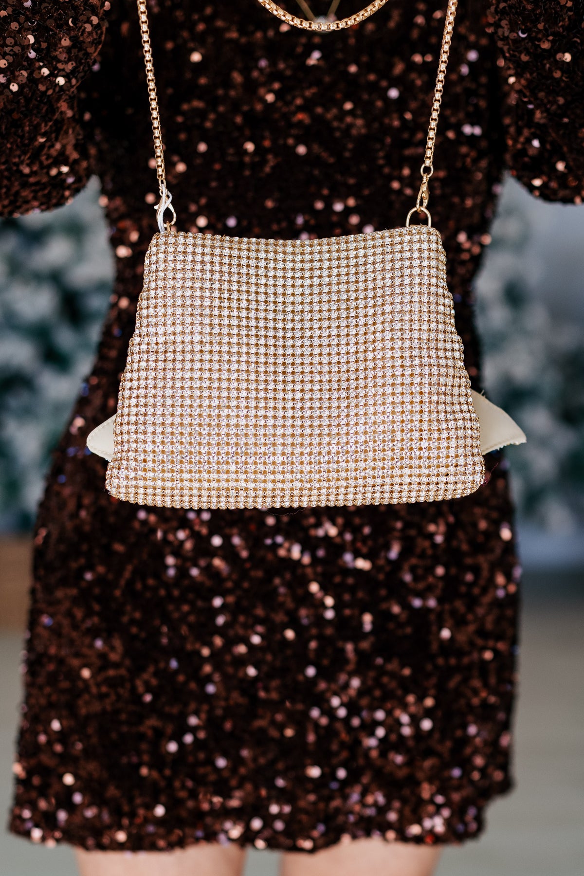 • Exterior Details: Detachable Chain Strap, Rhinestones All-over, Bow Detail