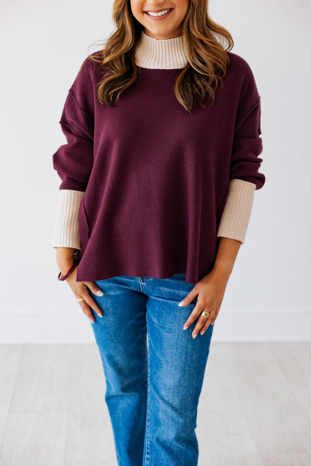 Embrace cozy style with this dark wine contrast ribbed sweater, your new fall favorite. Soft and comfortable, it offers a chic look that effortlessly elevates any outfit. Perfect for layering on crisp autumn days, this sweater adds a playful touch to your seasonal wardrobe.