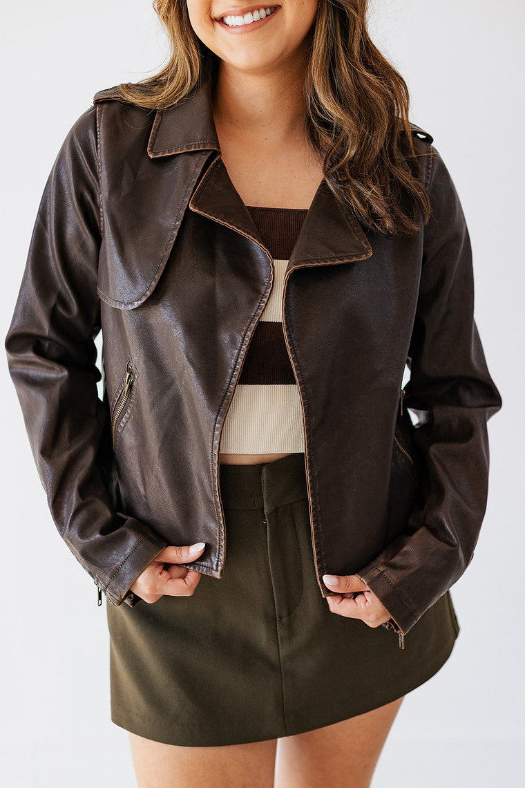 COCO BROWN DISTRESSED FAUX LEATHER JACKET