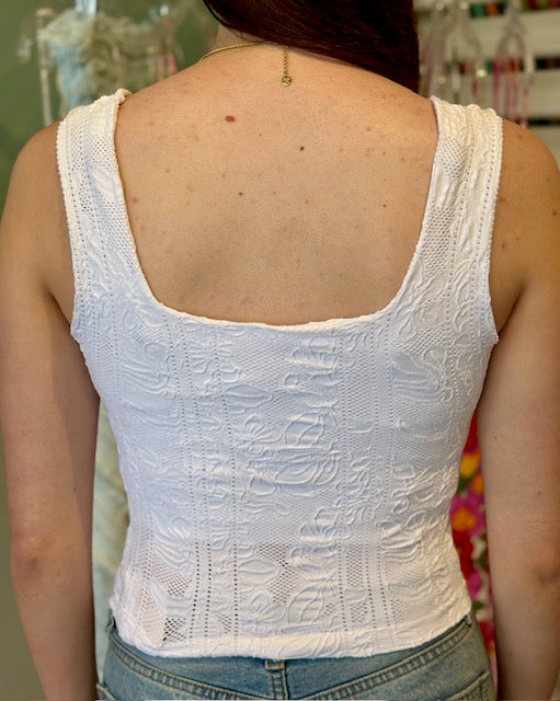 A seamless crop top featuring a square neck line and a lace texture. Designed with a double-layered construction, this top provides full coverage and is not see-through, combining sophistication with wearability.