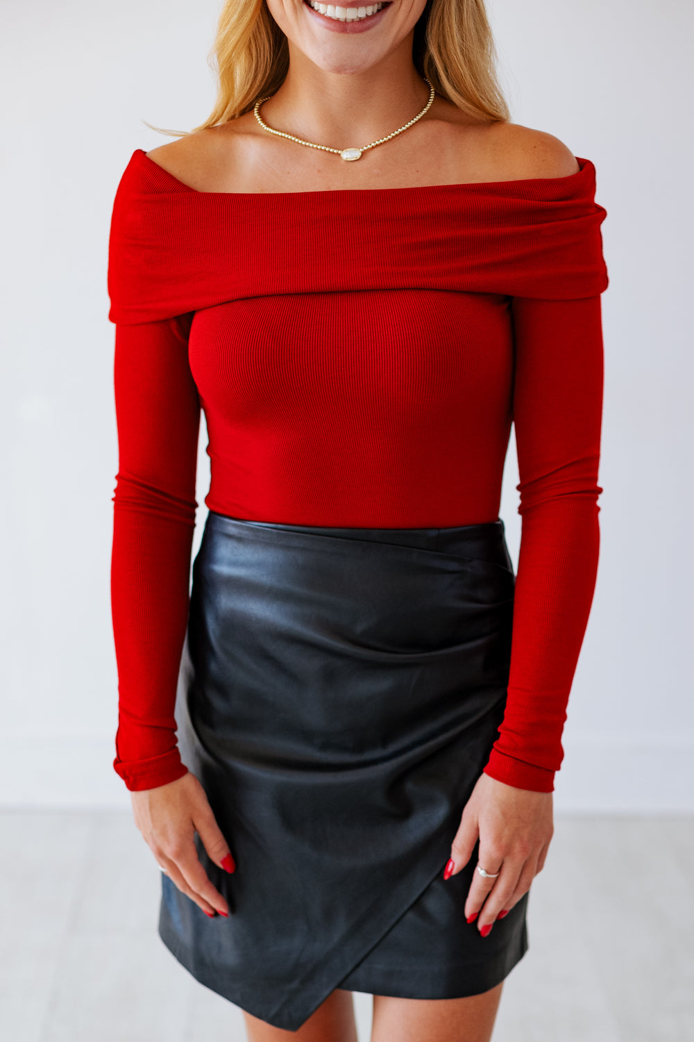 Embrace autumn vibes with this ruby red off-the-shoulder top featuring a flirty fold-over neckline. Perfect for layering or wearing solo, it adds a pop of bold color and playful charm to your fall wardrobe.