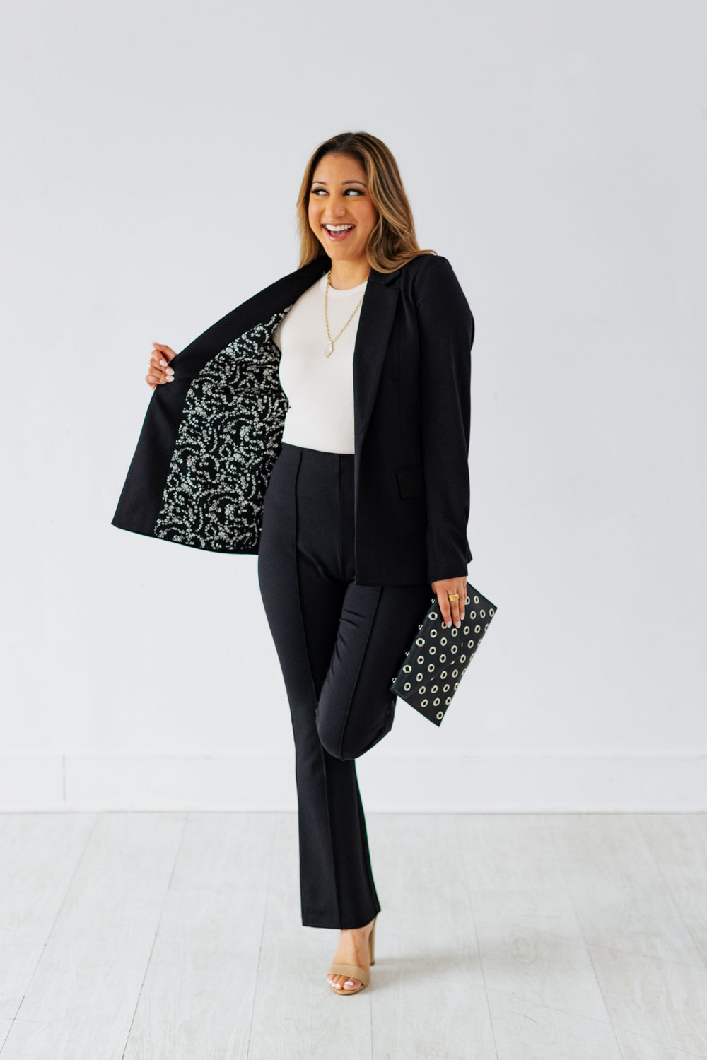 This black knit blazer effortlessly blends comfort with a touch of classy charm. Its sleek silhouette adds instant polish to any outfit, while the soft knit fabric keeps you feeling cozy and cool. Perfect for dressing up or down, it’s your go-to piece for making a stylish statement with ease.