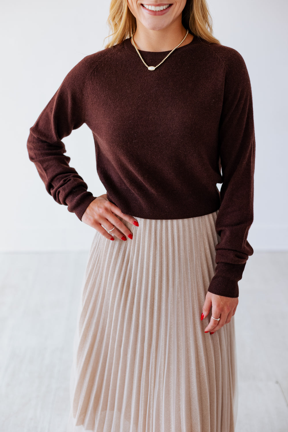 This chocolate brown cropped sweater is your new fall favorite. Cozy yet chic, it pairs perfectly with high-waisted jeans or skirts for effortless layering. Its warm tone adds a touch of autumn charm, making every cool day feel a bit cozier and more stylish.