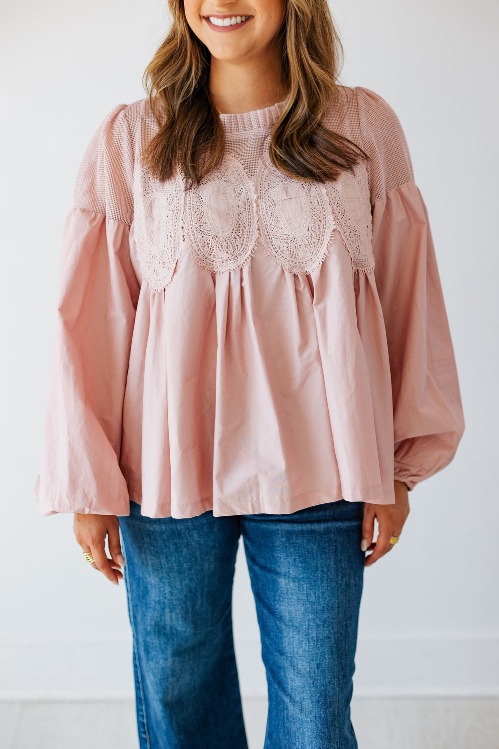 Embrace your playful side with this Blush Pink Lace Applique Blouse, a unique piece that effortlessly blends elegance and charm. The delicate lace detailing adds a classy touch, making it perfect for turning heads while keeping things fun and flirty.