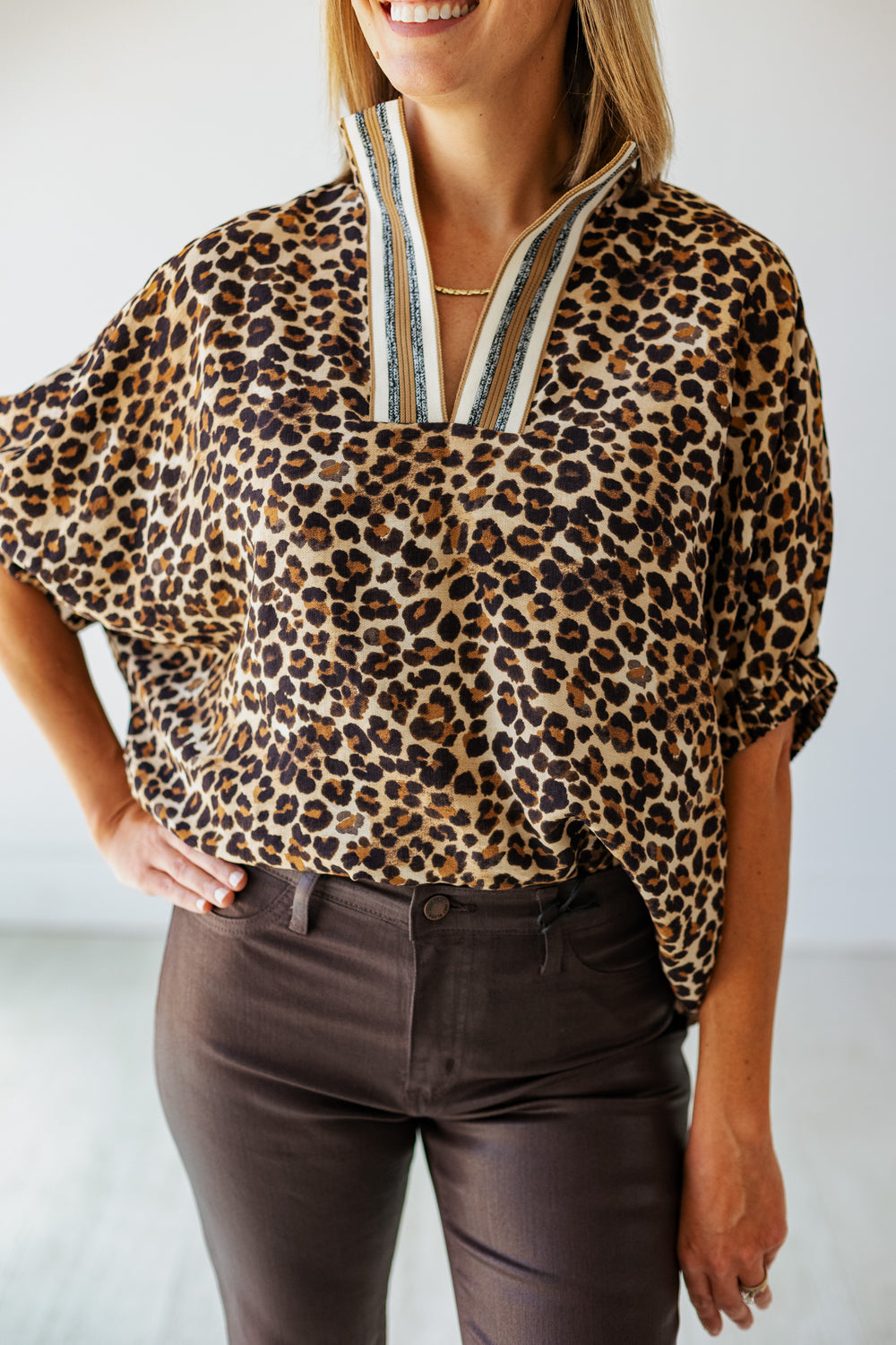 Elevate your style with this playful camel leopard highneck blouse, featuring chic neutral striped details that add a subtle twist to a classic look. Perfect for adding a touch of wild sophistication to any outfit, this blouse blends bold patterns with elegant design for a truly classy statement.