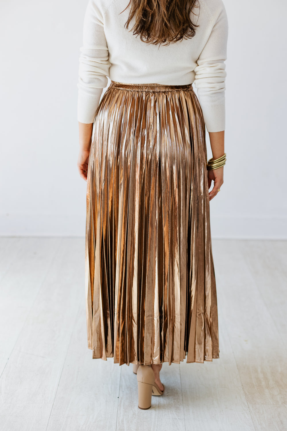 Add a touch of festive sparkle to your holiday parties with this shiny bronze pleated midi skirt. Its shimmering fabric catches the light beautifully, while the pleats create playful movement as you dance. Perfect for celebrating in style and turning heads at every gathering.
