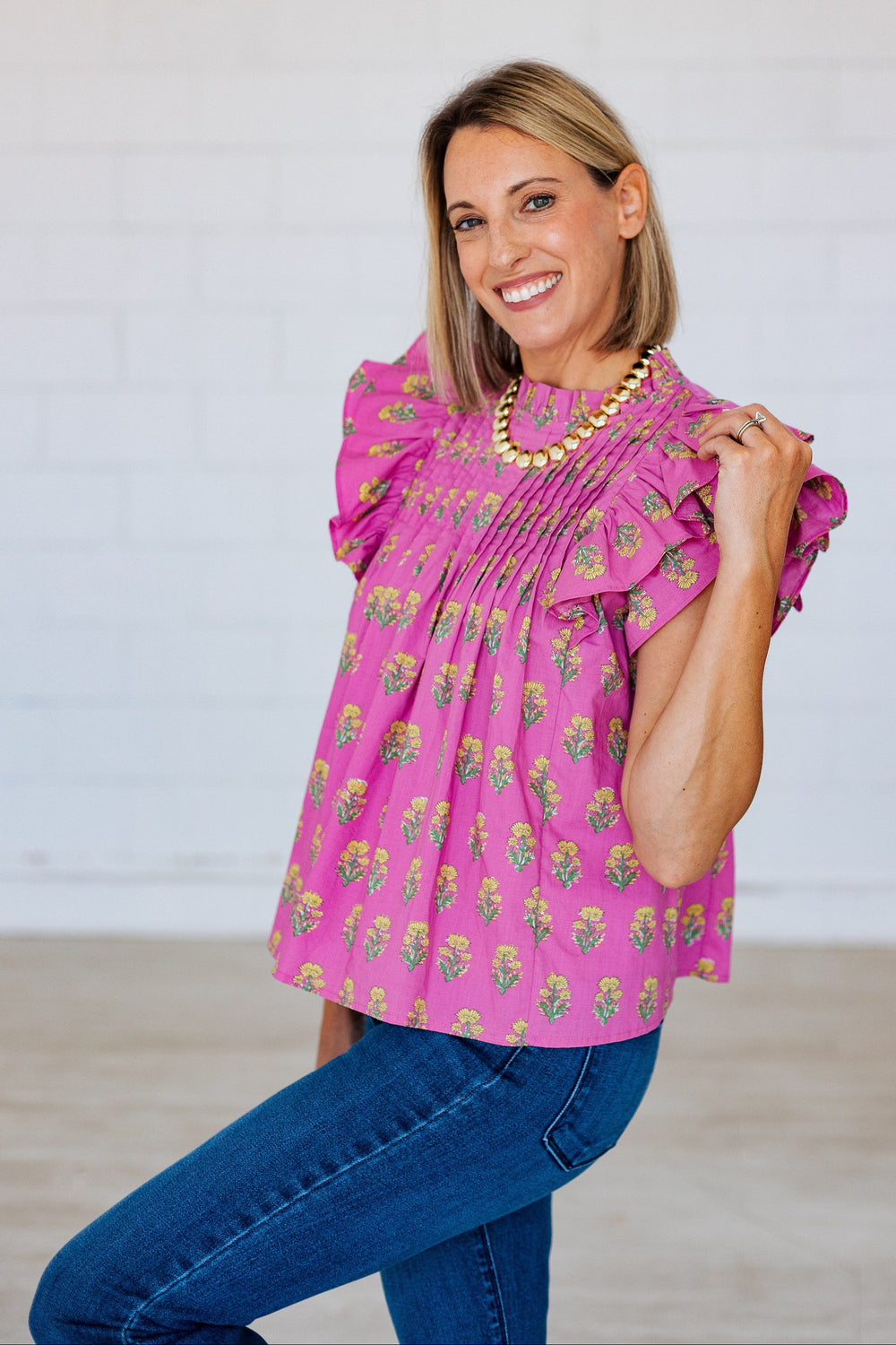 Brighten your wardrobe with the Sunflower Fields Blouse, featuring a playful purple base adorned with cheerful yellow florals. This cute blouse adds a fun, fresh vibe to any outfit, perfect for sunny days and happy moods.