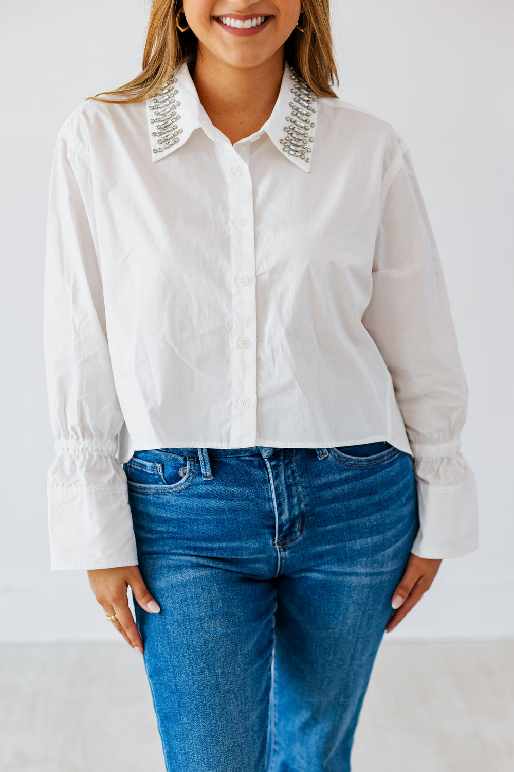 Make a statement with this white button-up featuring a sparkling rhinestoned collar. Perfect for adding playful glam to your everyday look, it’s the top that turns heads and keeps you shining all day long. The perfect layering piece for all of your Fall sweaters!