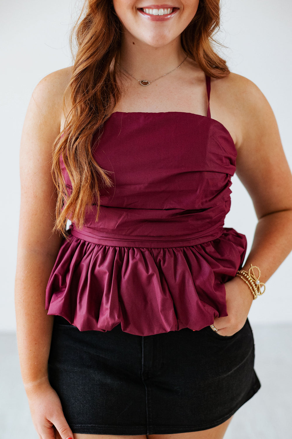Get ready for gameday in this fun and flirty burgundy peplum poplin top. Its flattering silhouette adds a playful twist to your look, perfect for cheering on your team in style. Comfortable and chic, it’s a must-have for spirited days and lively nights.
