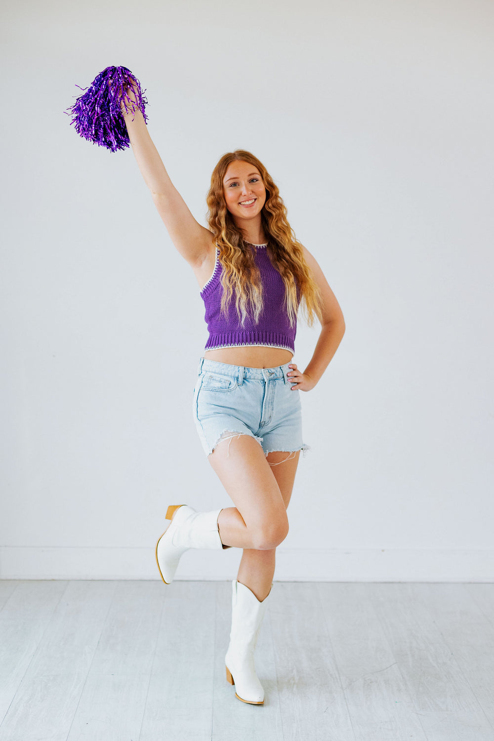 Get game day ready with this playful purple sleeveless sweater! Its vibrant hue adds a fun pop of color, while the sleeveless design keeps you cool and comfy. Perfect for cheering on your team in style or layering up for those unpredictable weather moments. Make every game day a little brighter and a lot more fun!