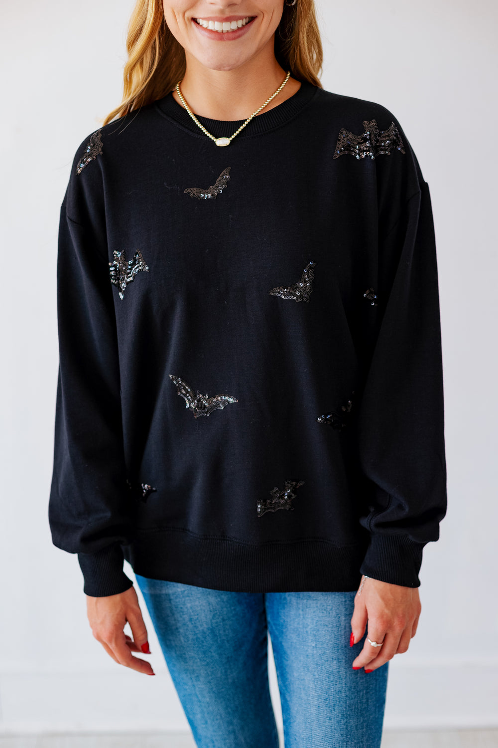 Get into the spooky spirit with this playful sequin bats sweatshirt, perfect for your Halloween wardrobe. Sparkling black bats flutter across this cozy sweatshirt, adding a fun, festive touch to chilly fall days. It’s the ideal mix of comfort and sparkle to keep you stylishly eerie all season long.