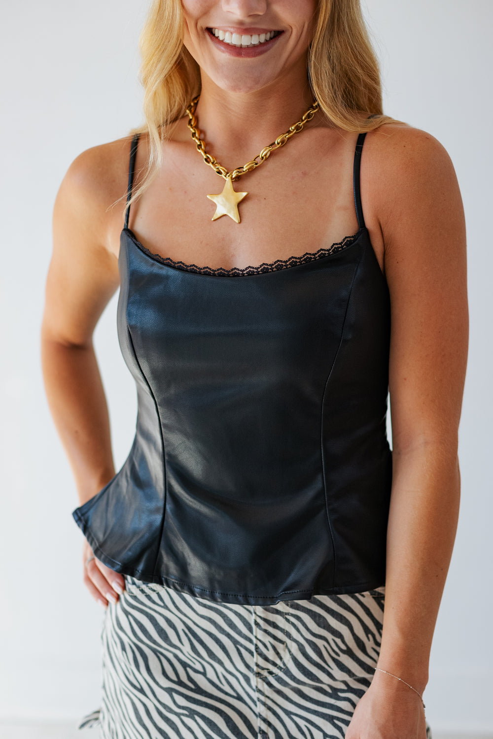 Elevate your look with the Stacy Leather Cami Top in sleek black. This playful yet edgy piece features a smooth leather finish and a flattering cami silhouette that’s perfect for day-to-night style. Pair it with jeans or a skirt for an effortlessly cool vibe that turns heads wherever you go.