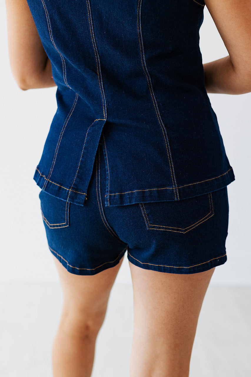 Step into summer fun with the Dahlia Stretch Dark Denim Short—your new go-to wardrobe staple! These shorts blend classic dark denim with just enough stretch for all-day comfort and easy movement. Perfect for everything from backyard barbecues to spontaneous beach trips, they’ll keep you looking stylish and feeling free. Pair with our Dahlia Stretch Dark Denim Vest for the perfect look!