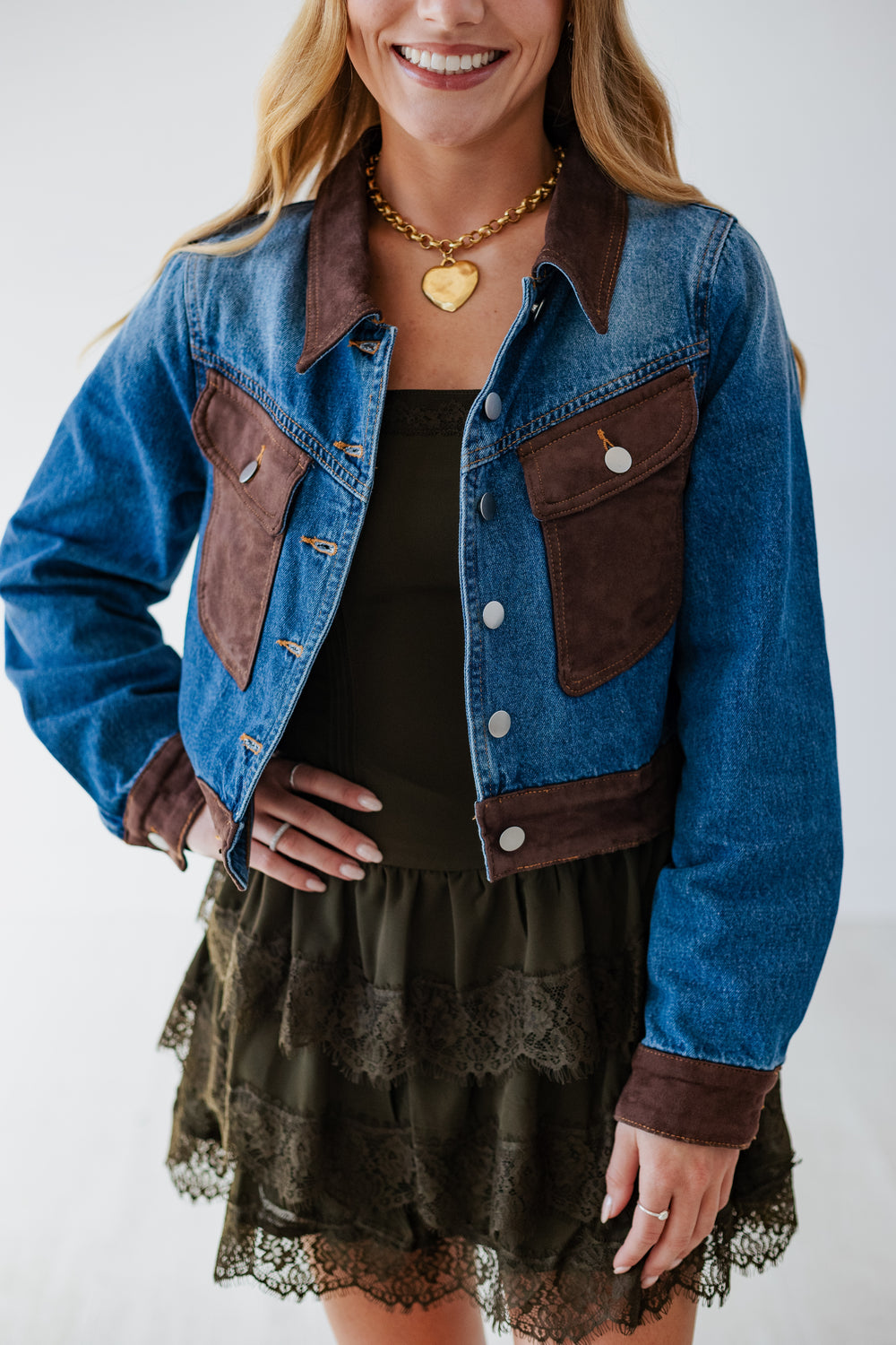 Add a dash of warmth and style to your fall wardrobe with this jean jacket featuring rich brown suede detailing. Perfect for crisp autumn days, it blends classic denim with a cozy, textured twist—making every outfit feel a little more fun and a lot more fabulous. Slip it on and watch your seasonal style soar!