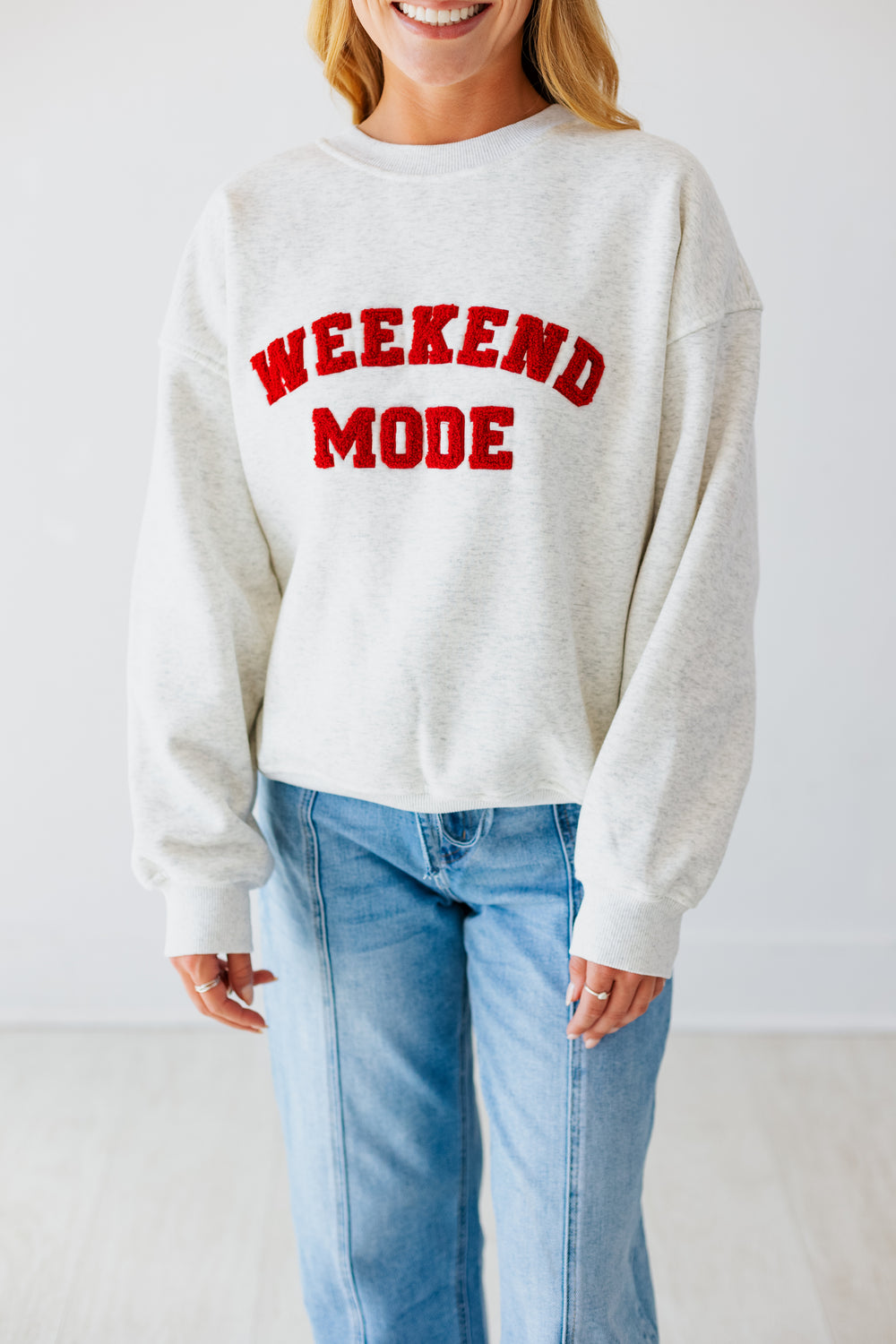 Stay cozy and stylish in this heather gray sweatshirt featuring bold red letters that proudly say "weekend mode." Perfect for your winter wardrobe, it keeps you snug while adding a fun, laid-back vibe to any casual outfit. Kick back, relax, and make every weekend feel like a celebration.