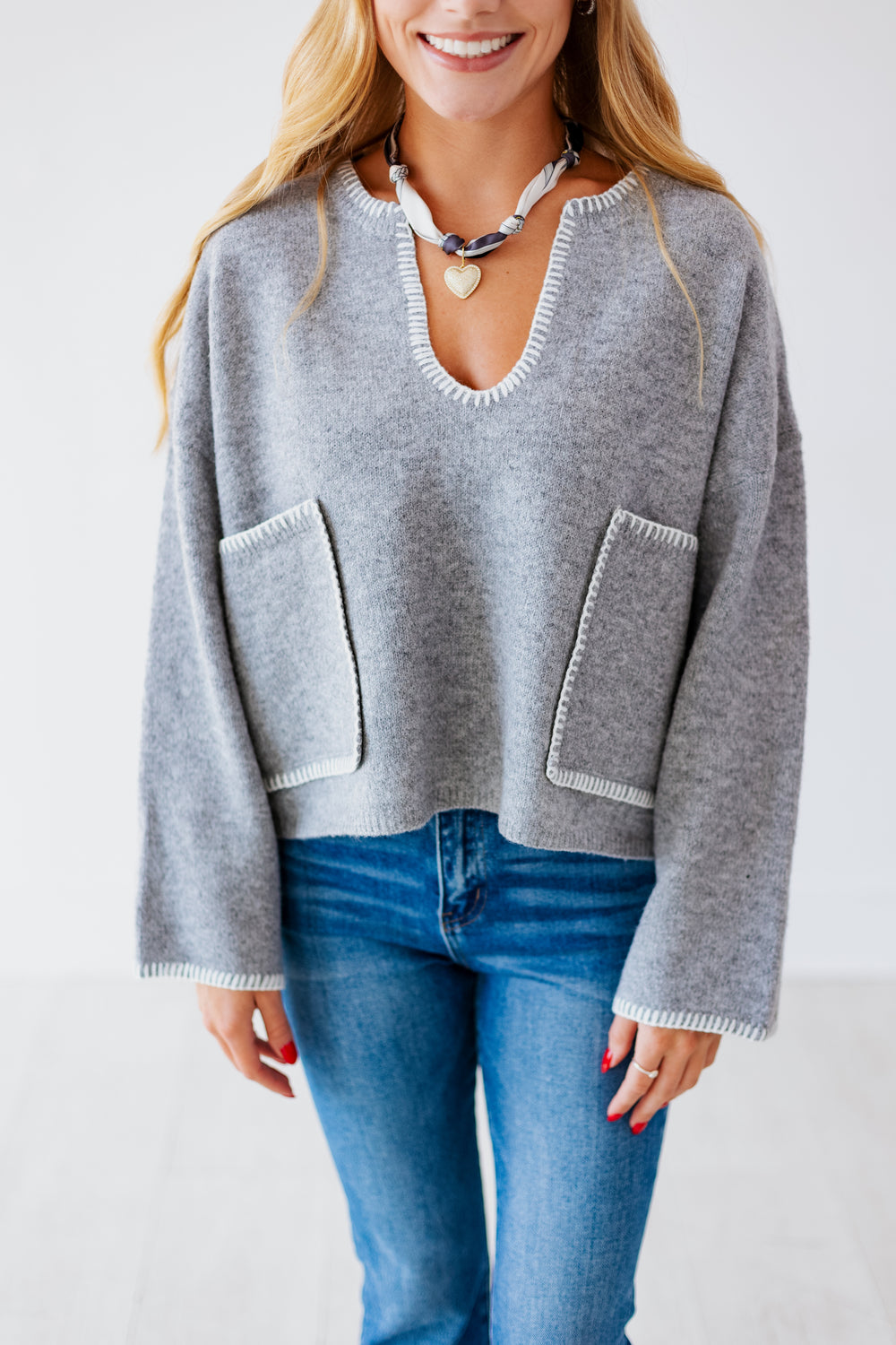 Cozy up your fall wardrobe with the Stella Whipstitch Sweater in a soft heather grey. Its charming whipstitch detailing adds a playful touch to a classic design, making it perfect for layering on crisp autumn days. Light, comfy, and stylish—this sweater is ready to become your new seasonal favorite.