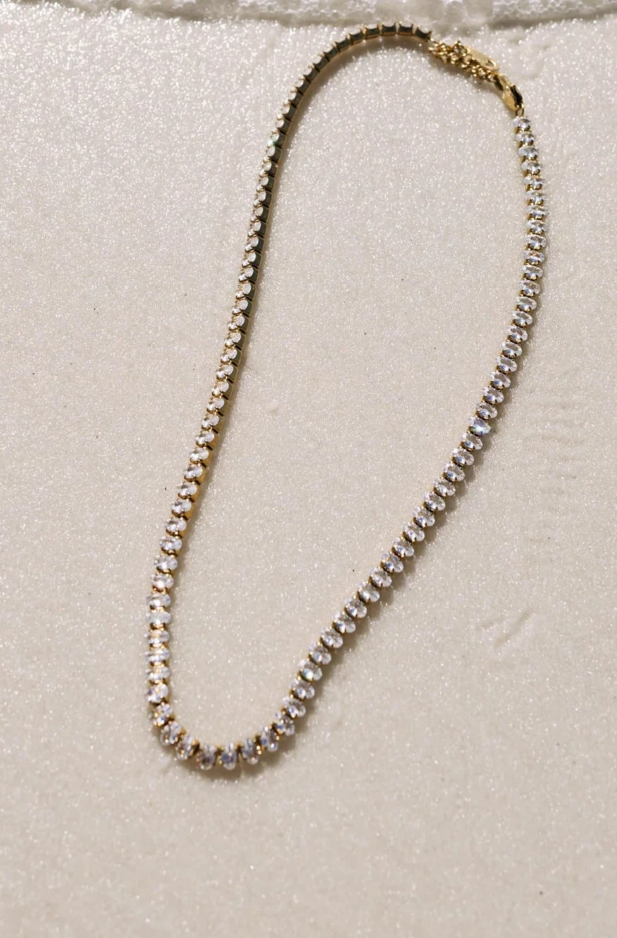 Discover the Henrietta Oval Tennis Necklace—where timeless sparkle meets modern flair. This playful take on a classic features an elegant oval design that catches light from every angle, making it the perfect companion for everything from casual coffee dates to special nights out. Versatile, radiant, and undeniably chic, it's the jewelry piece that effortlessly elevates your everyday style