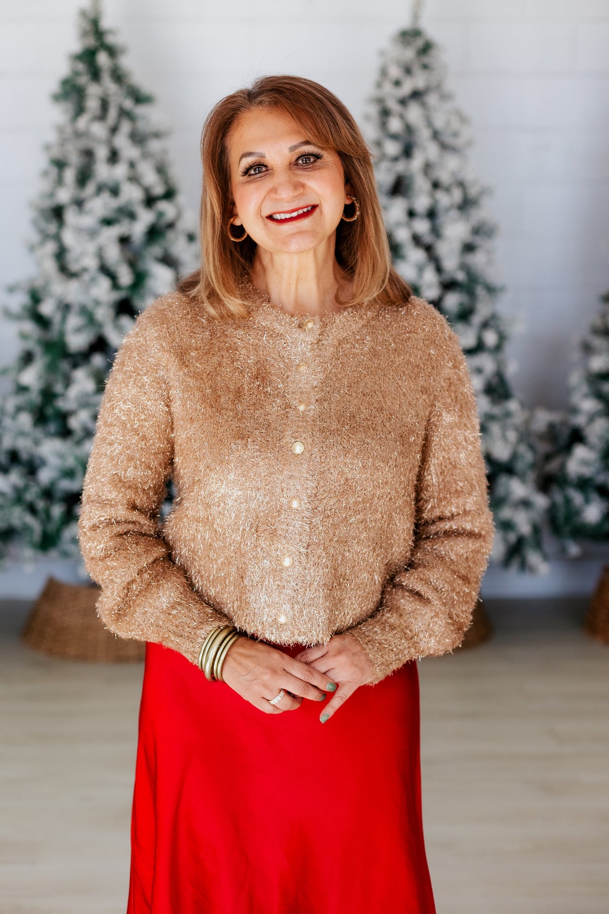 Wrap yourself in cozy luxury with our Golden Hour Bronze Fuzzy Cardigan—the ultimate winter essential that feels as good as it looks. This plush, golden-hued layer brings warmth and sophistication to any cold-weather outfit, whether you're lounging at home or stepping out in style. Soft, snuggly, and effortlessly chic, it's the cardigan you'll reach for again and again when temperatures drop.
