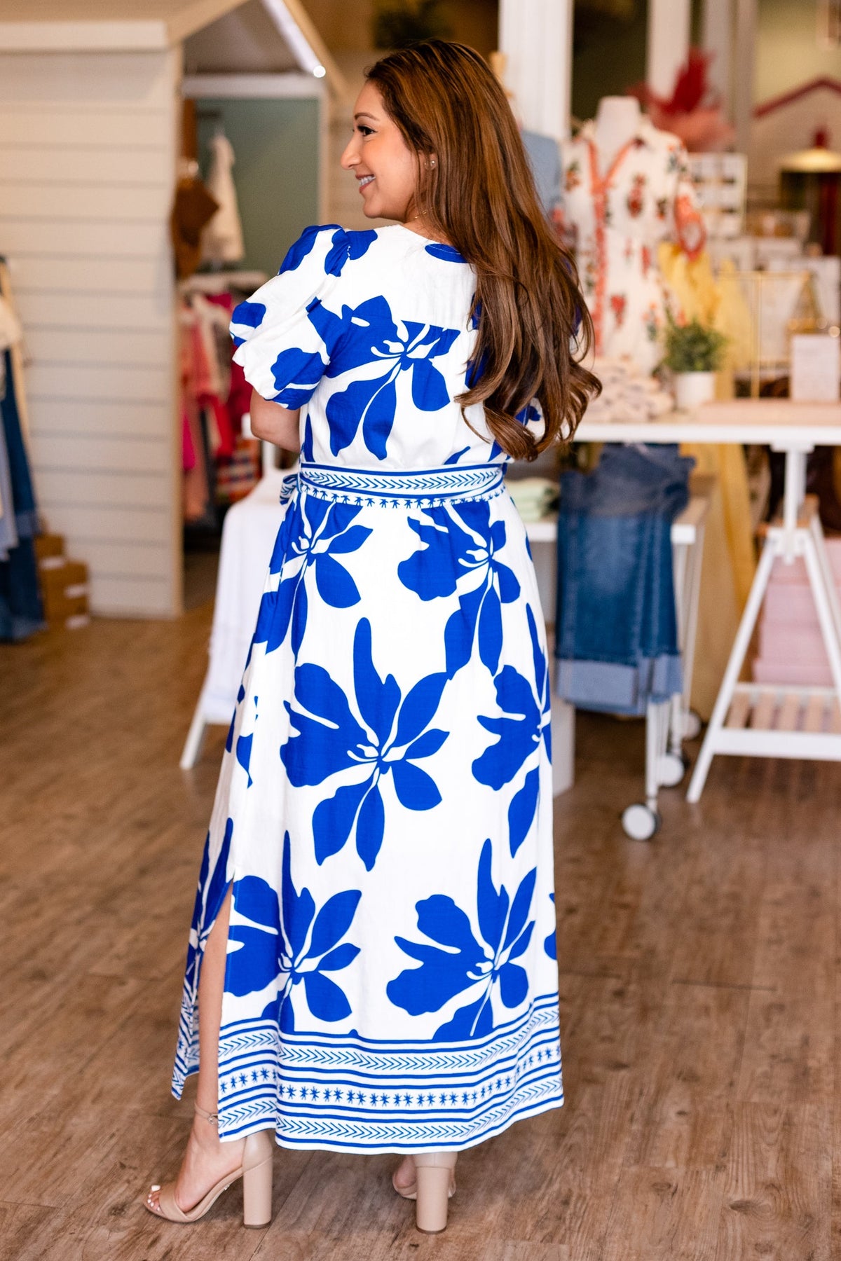 Radiate effortless charm in this delightful midi dress featuring crisp white fabric adorned with striking cobalt blue florals. Playful puff sleeves add a touch of whimsy while the adjustable waist tie lets you customize your silhouette for the perfect fit. At midi length, it's the ideal balance of fun and polished—ideal for brunch dates, garden parties, or any occasion where you want to feel both comfortable and fabulous!