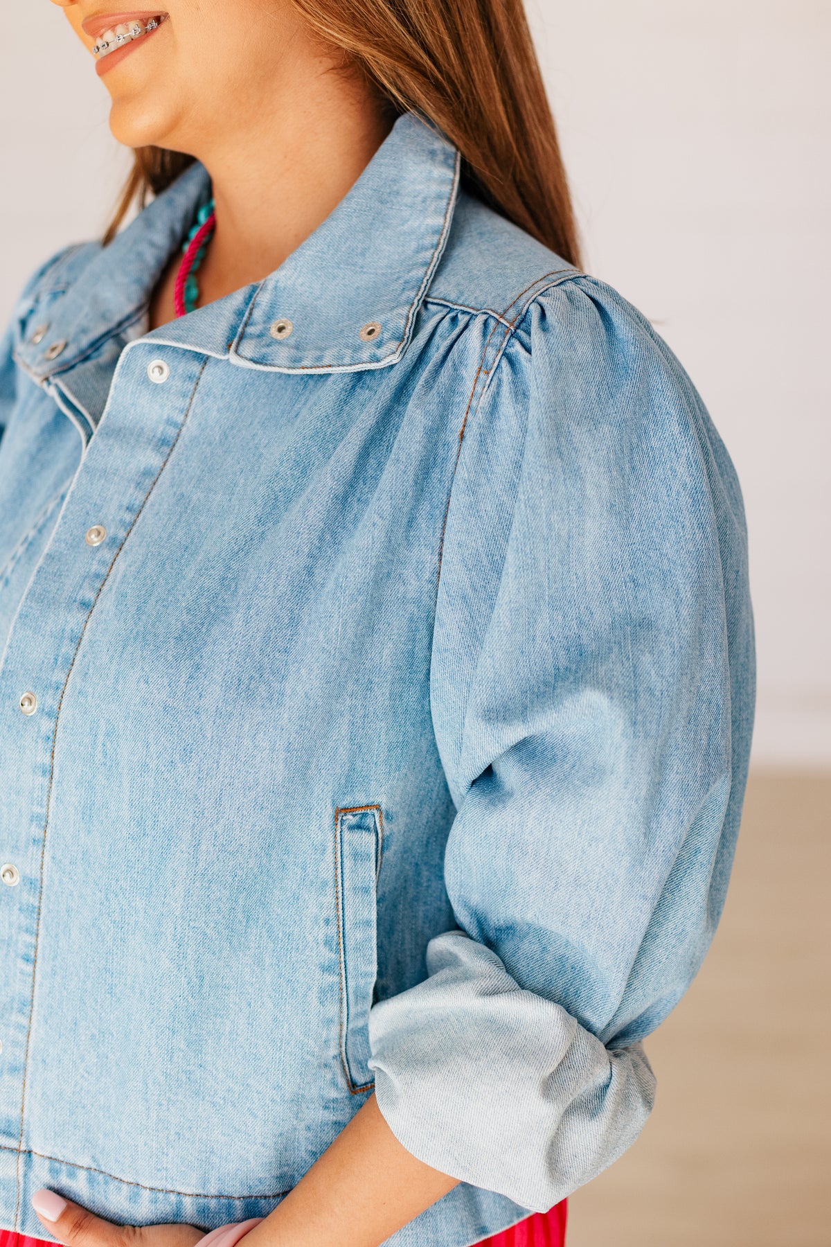 Meet FIONA—the denim jacket that refuses to blend in! This light-wash beauty boasts flared sleeves that turn heads, wrapped in a distinctively modern silhouette that breaks all the boring rules. Button up front and ready for adventure, it's the perfect layer for anyone who wants their jacket to do the talking. Throw it over anything and watch your outfit instantly level up with unexpected charm and undeniable cool-girl energy.